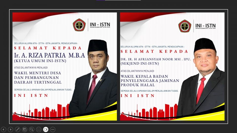 INI-ISTN mengucapkan selamat menampuk tanggung jawab baru kepada Ir. Ahmad Riza Patria, M.B.A (Ketum INI-ISTN) dan  DR. Ir. Afriansyah Noor, M.Si. , IPU (Sekjen INI-ISTN).Semoga Amanah dalam menjalankan tugas-tugas kenegaraan setelah pelantikan oleh Presiden RI untuk masa jabatan 2024-2029.A Riza Patria (Kuncung 89) dipercaya menjadi Wakil Menteri Desa dan Pembangunan Daerah Tertinggal.